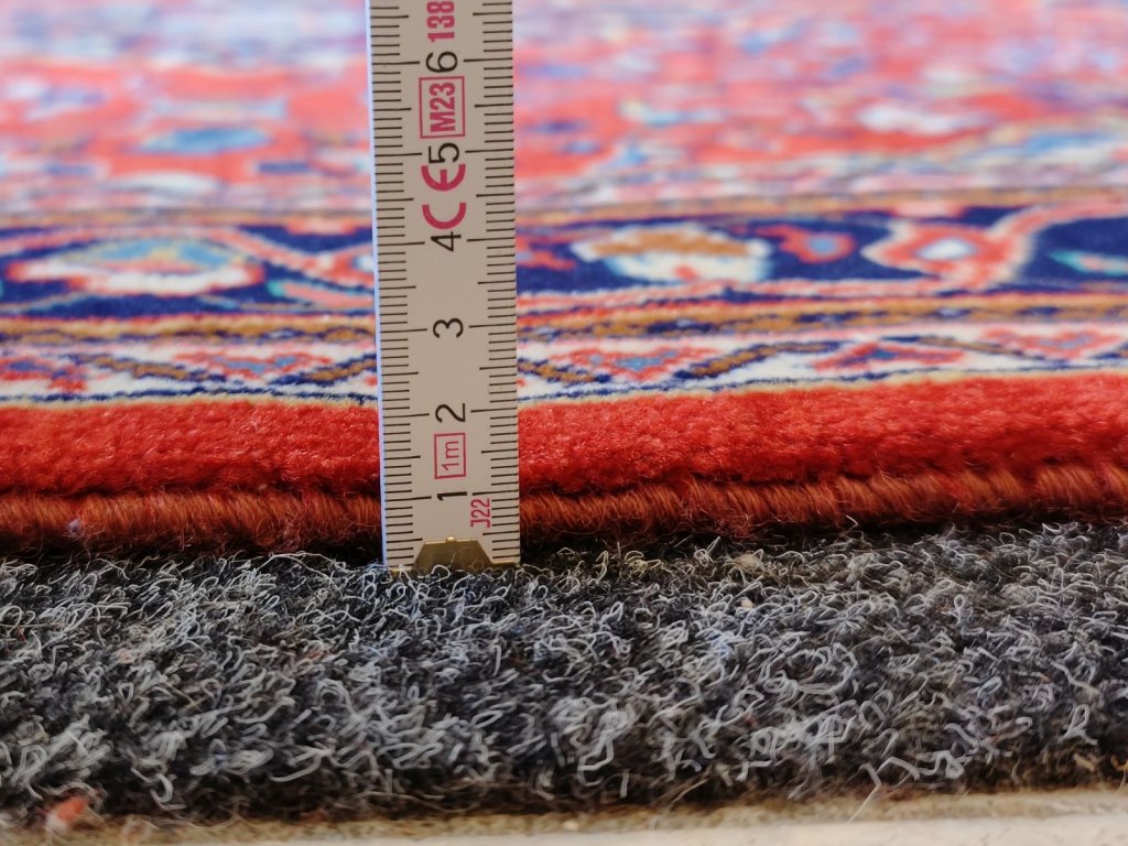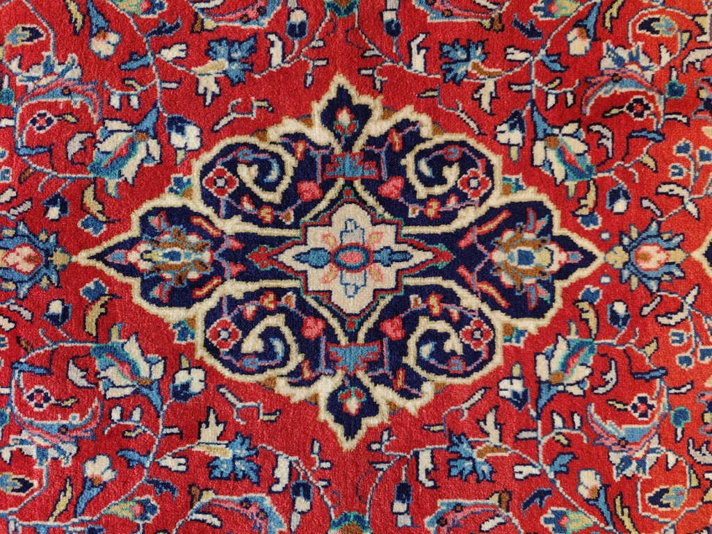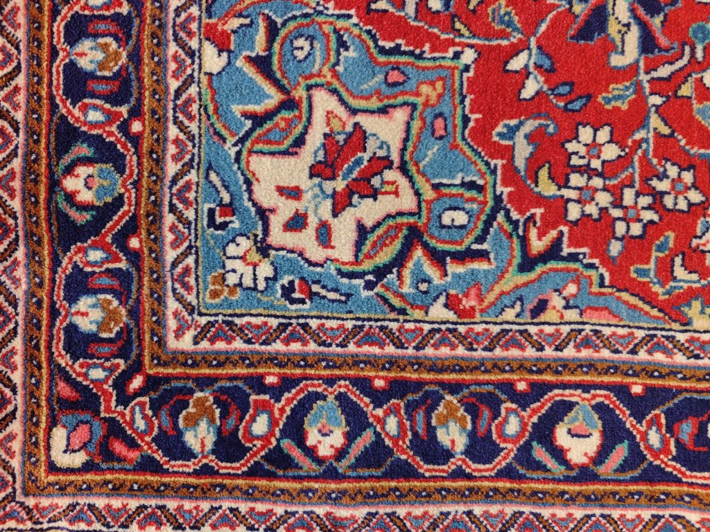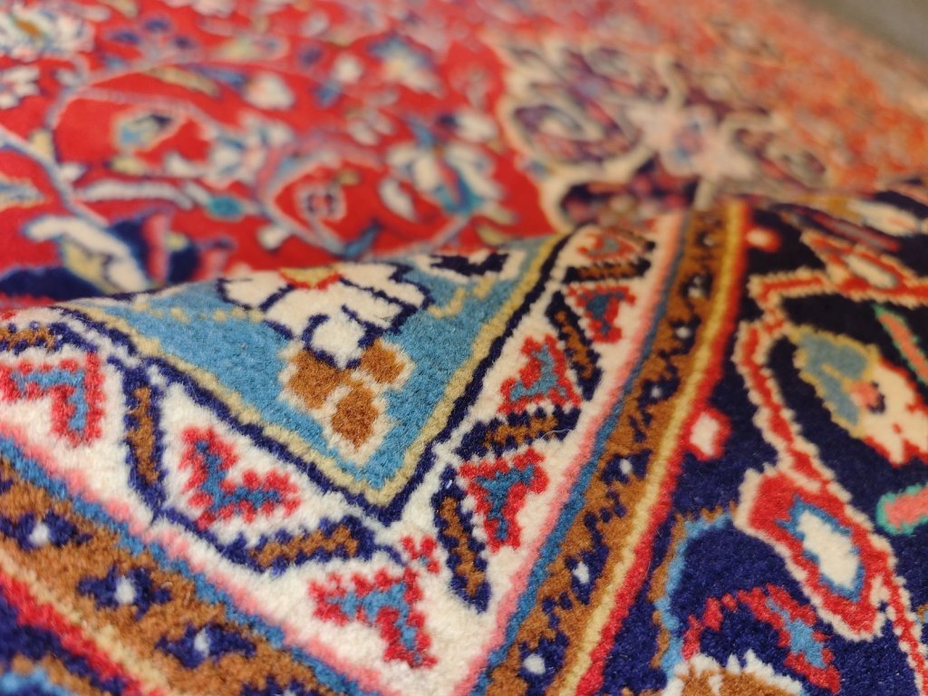 Hluboká barevná harmonie: Typický Kashan poznáte podle královské červené v kombinaci s temně modrým medailonem a okraji. Často se objevují i jemnější odstíny slonoviny a šampaňské, které koberci dodávají lehkost.