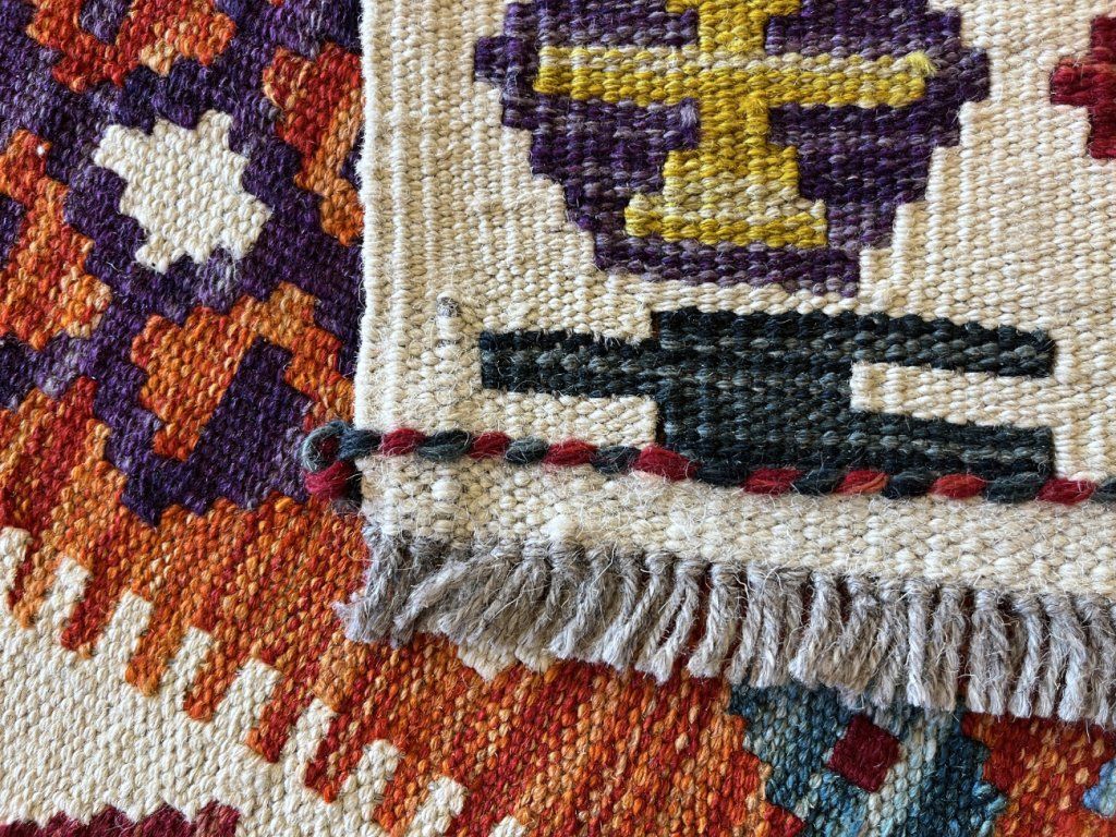Ručně tkaný: Kelim je zhotoven gobelínovou technikou na plochých stavech bez použití vlasu, což mu dodává charakteristickou plochou strukturu. Tato technika zajišťuje pevnost a dlouhou životnost koberce.
