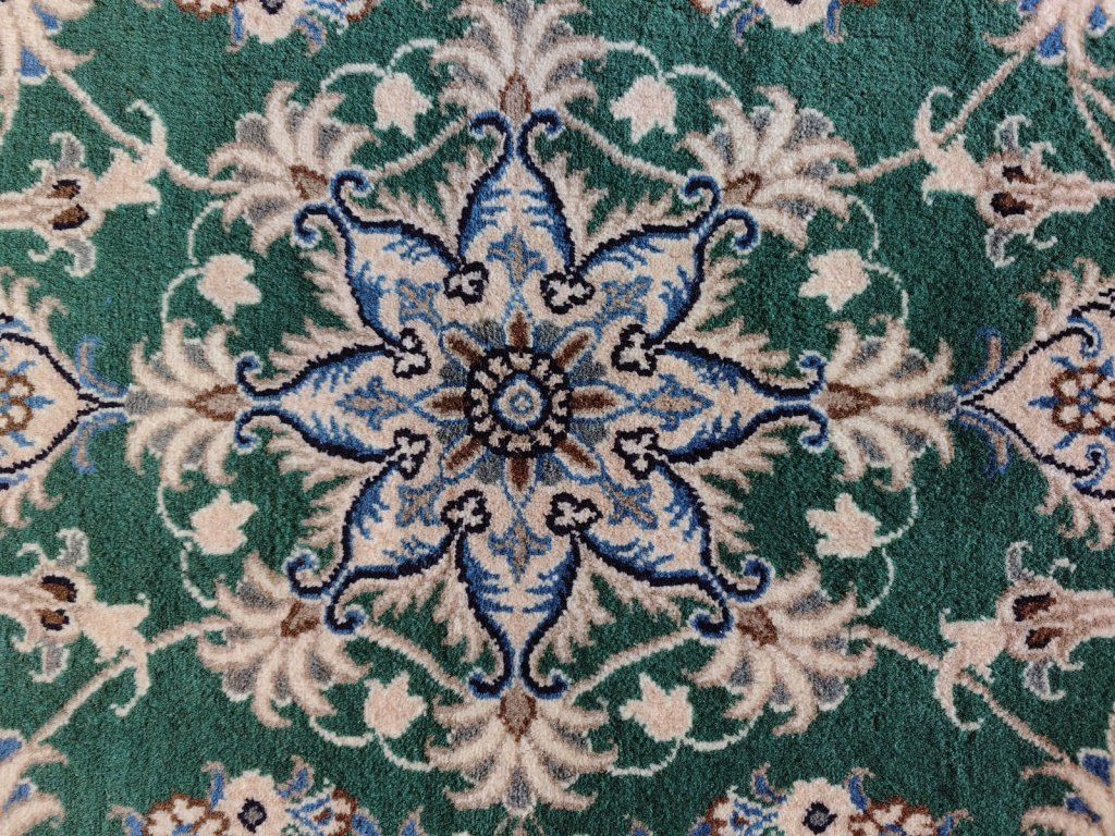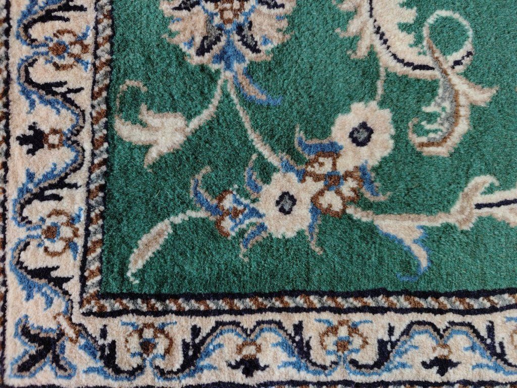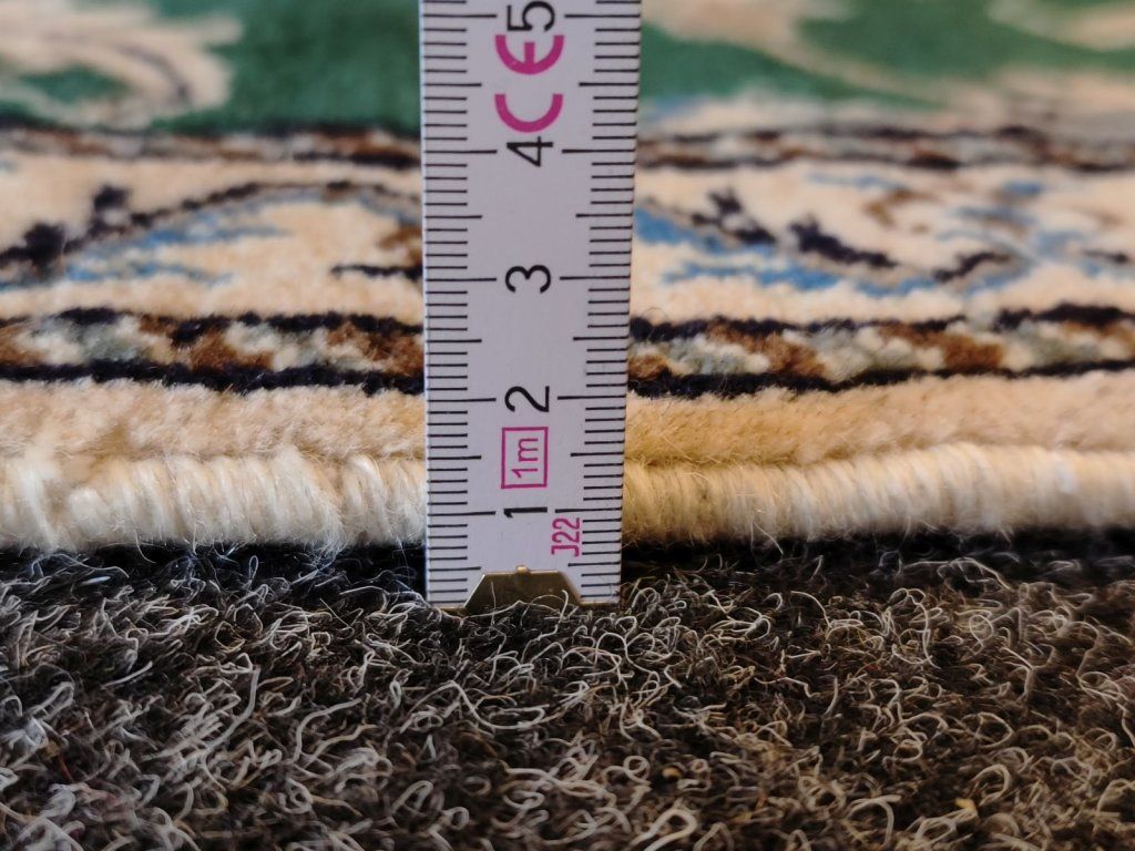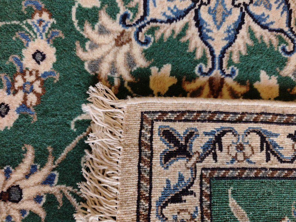 Detaily zvýrazněné hedvábím: I když jde primárně o vlněný koberec, mistři tkalci v Nainu často používají čisté hedvábí k obroubení vzorů (tzv. konturování). Výsledkem je, že květinové motivy při dopadu světla jemně vystupují z plochy a koberec získává fascinující hloubku a lesk.